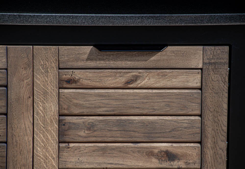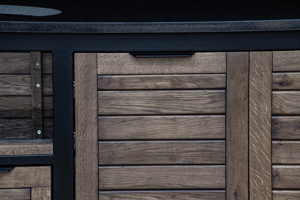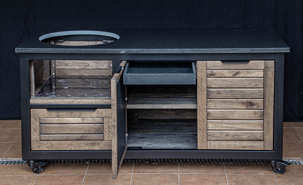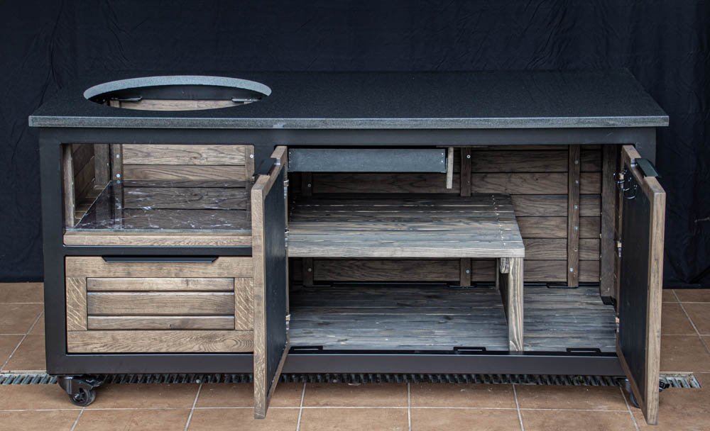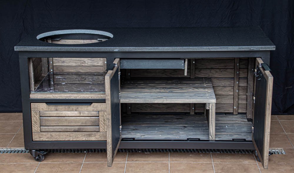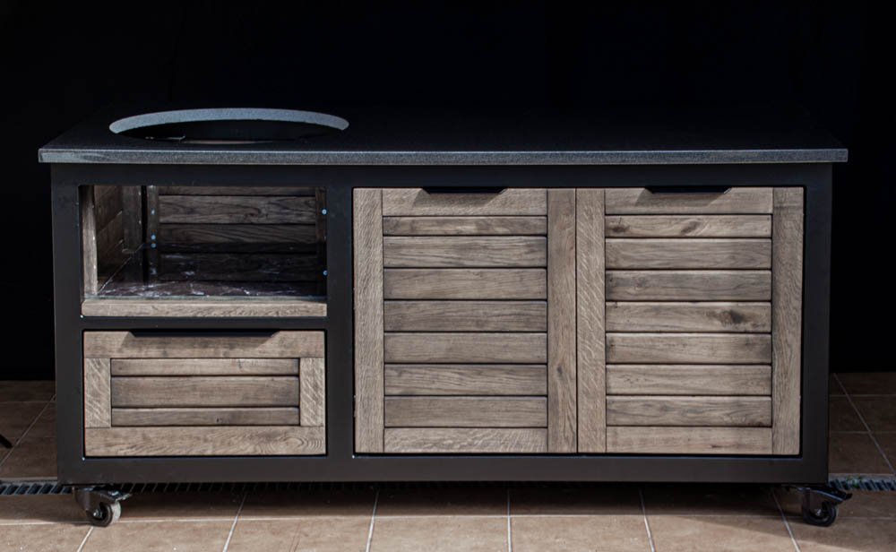 Vientisas metalo rėmas ir natūralaus Ąžuolo apdaila. Grill stalas pritaikytas daugeliui BBQ kepsninių – Green Egg, Kamado Joe, Kamado BONO, Kamado Club, Kamado Club Pro, Mustang ir kt.